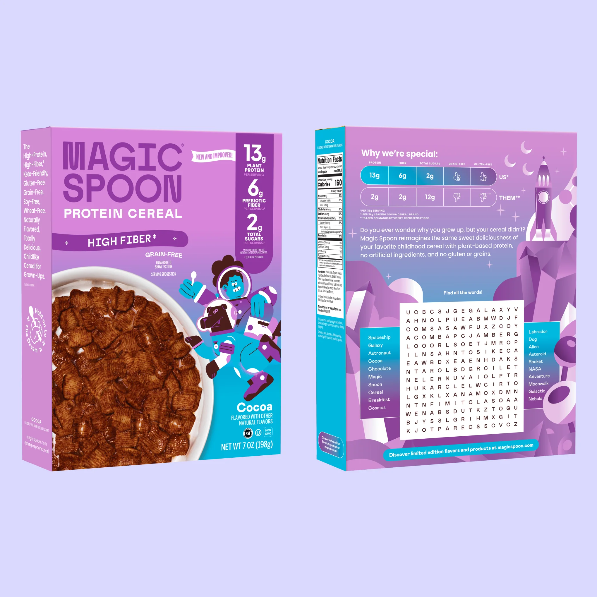 Rich and chocolatey with real cocoa, our Cocoa Protein + Fiber Cereal packs 13g plant-based protein, 6g prebiotic fiber, and just 2g sugar per serving. Extra-crunchy square pieces deliver nostalgic sweetness and deep chocolate flavor that satisfies any time of day.