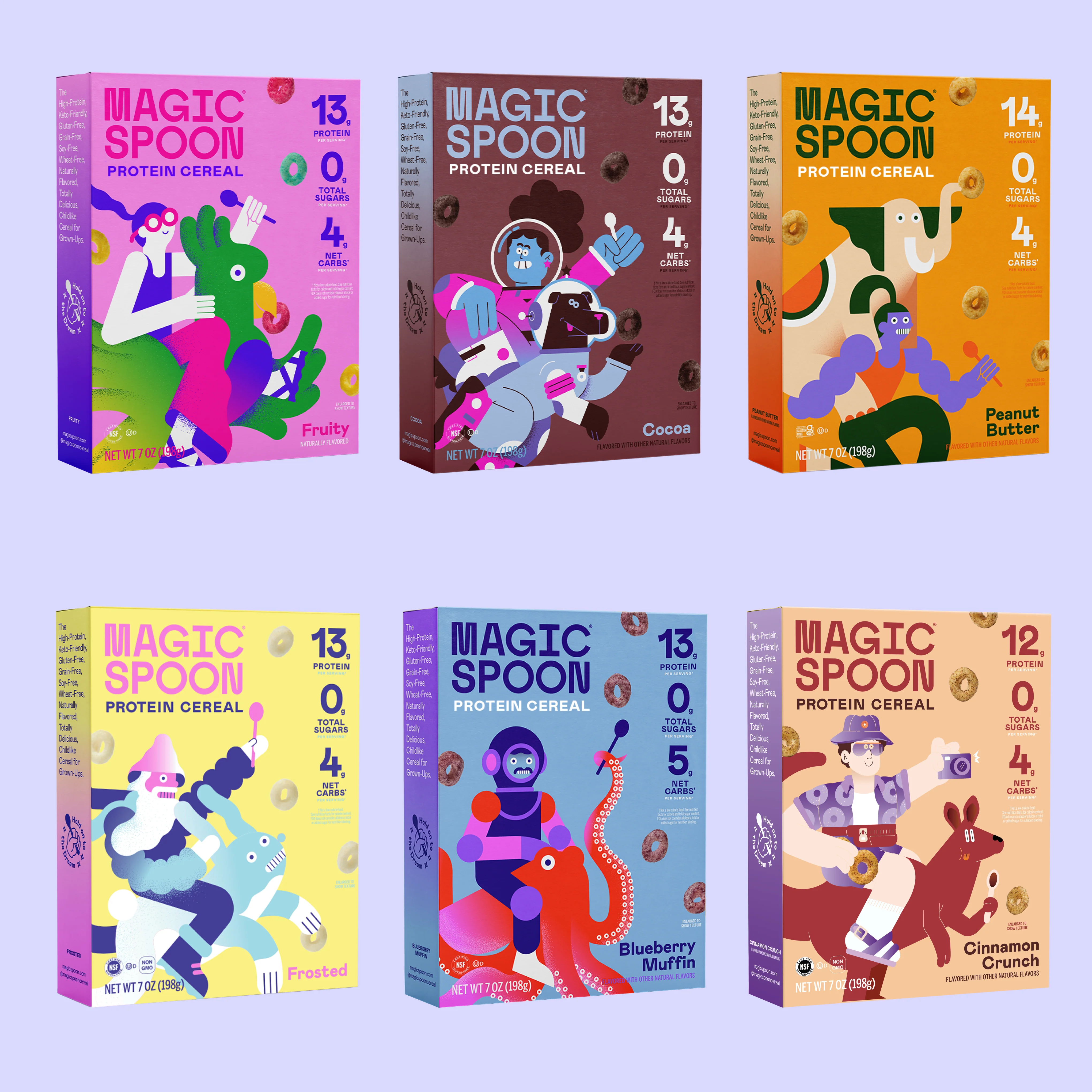 The ultimate Magic Spoon Starter Pack! Try all of our classic flavors—Fruity, Frosted, Cocoa, Peanut Butter, Blueberry Muffin, and Cinnamon Crunch, plus get our one-of-a-kind Zebra bowl and spoon set. We’ve reimagined all your favorite childhood cereals with 4-5g net carbs, 12-14g complete protein, 140 calories, and no artificial ingredients.
